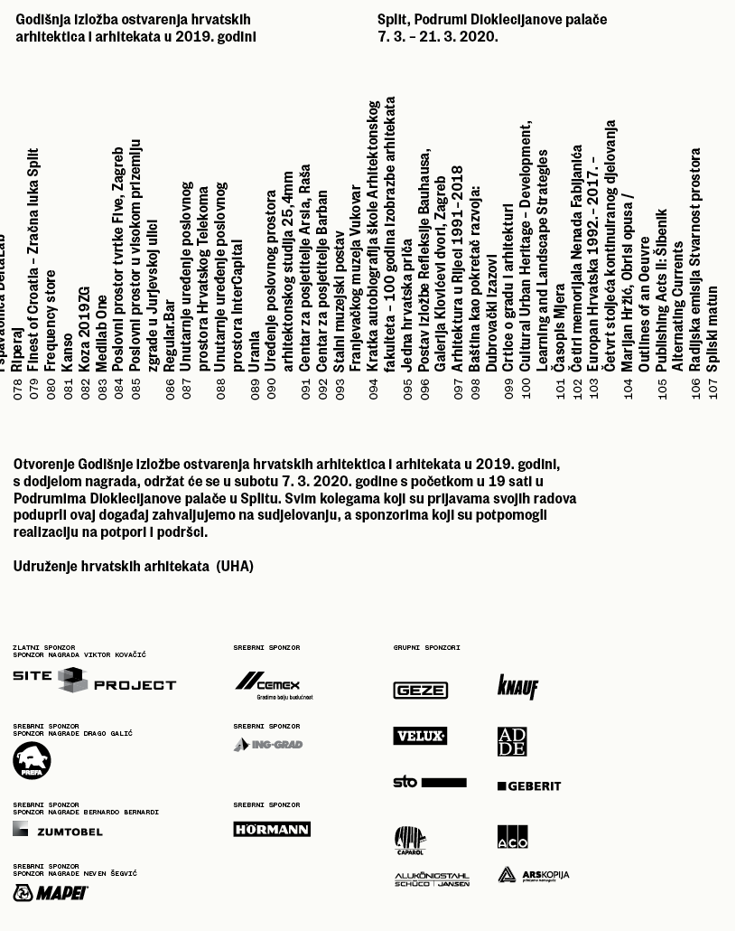 Pozivamo vas na Godišnju izložbu ostvarenja hrvatskih arhitektica i arhitekata u 2019. godini te dodjela nagrada Udruženja hrvatskih arhitekata (UHA). Godišnja izložba realizira se u suradnji s Društvom arhitekata Splita (DAS).