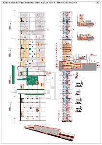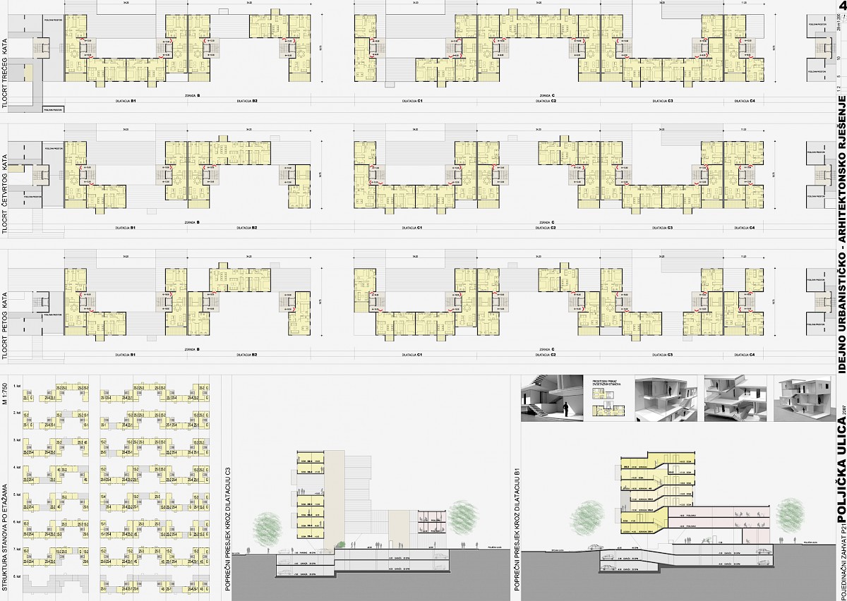 Rad svojim jakim potezom i lepršavim ritmom građevina prepoznaje longitudinalni karakter parcele i doživljaj gradskog bloka kao niza sekvenci pretpostavljenih pokretom i prolaskom kroz Poljičku ulicu. Također, stakato ritam volumena uvjetovan je i pažljivim meandriranjem građevne strukture, a u cilju osiguranja kvalitetnog pogleda i osunčanja svake stambene i poslovne jedinice.