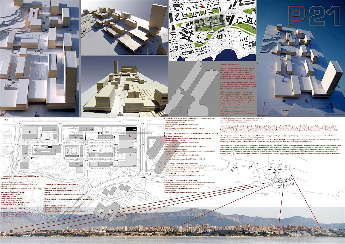 Rad sagledava širi urbani kontekst (analizirajući skyline Splita i postojeće vertikalne akcente), te analizira zonu Blatina čija kompozitna pravila i replicira.