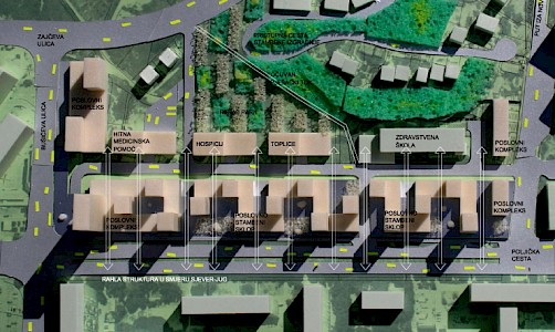 Gradeći megastrukturu uz Poljičku ulicu autor izuzetno kvalitetno pretače program natječaja u treću dimenziju. Disciplinirano gradeći vertikalni i horizontalni zoning zadanih poslovnih i stambenih parametara, tijek projektiranja autora podsjeća na dječje slaganje LEGO kockica.