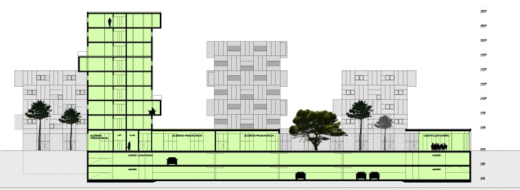 Razvučeni meandarski niz stambenih lamela uvlači se u odnosu na pročelje kuće neposredno uz Poljičku ulicu i nadograđuje na poslovni dio zgrade koji se uz Poljičku materijalizira kao puno-prazno naizmjenično nizanje poslovnih volumena i parkovnih površina.