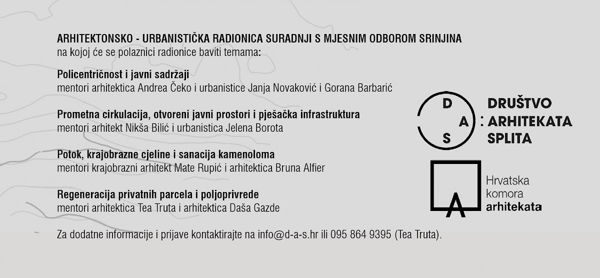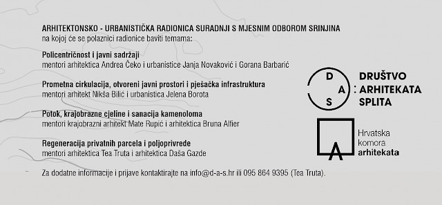 Radionica se odvija uz podršku Mjesnog odbora Srinjine, Društva arhitekata Splita i Hrvatske komore arhitekata.