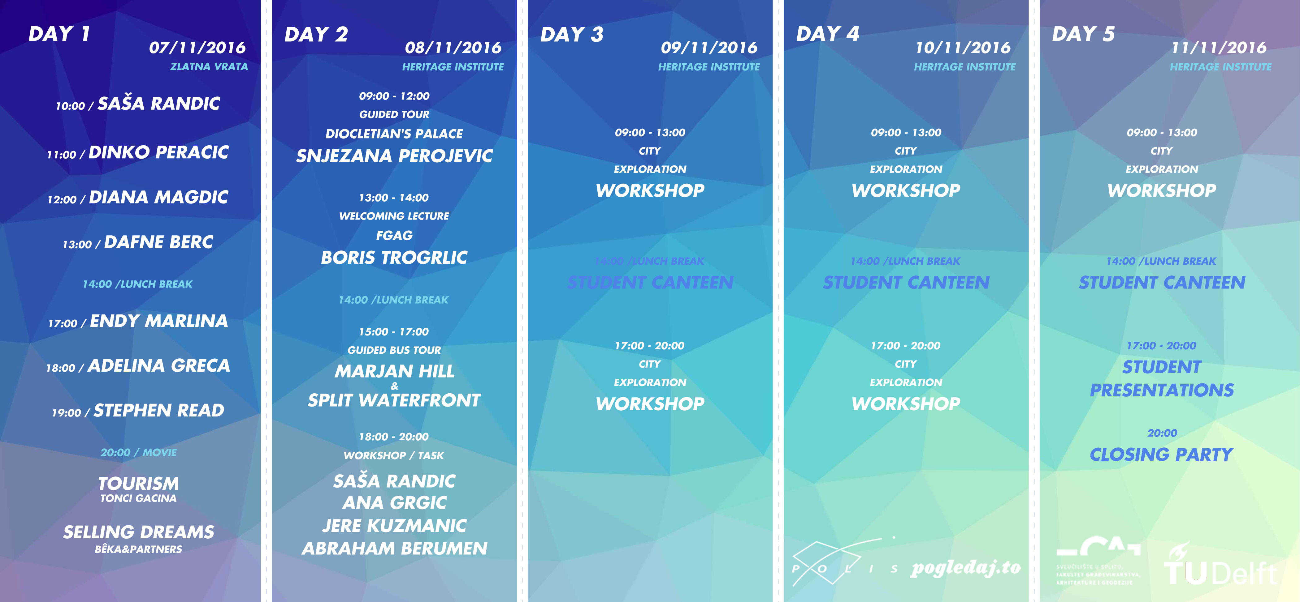 Sedmodnevna zajednička radionica arhitektonskih studenata TU Delft i FGAG Split bavit će se prepoznavanjem fenomena suvremenog turizma, i utjecaja koje nove migracije imaju na strukturu grada. Na radionici će sudjelovati po 20 studenata sa svakog sveučilišta, u miješanim grupama. Pozvane su i druge zainteresirane osobe da se jave organizatorima. Ako ima mjesta, sudjelovanje je dobrodošlo i besplatno!
