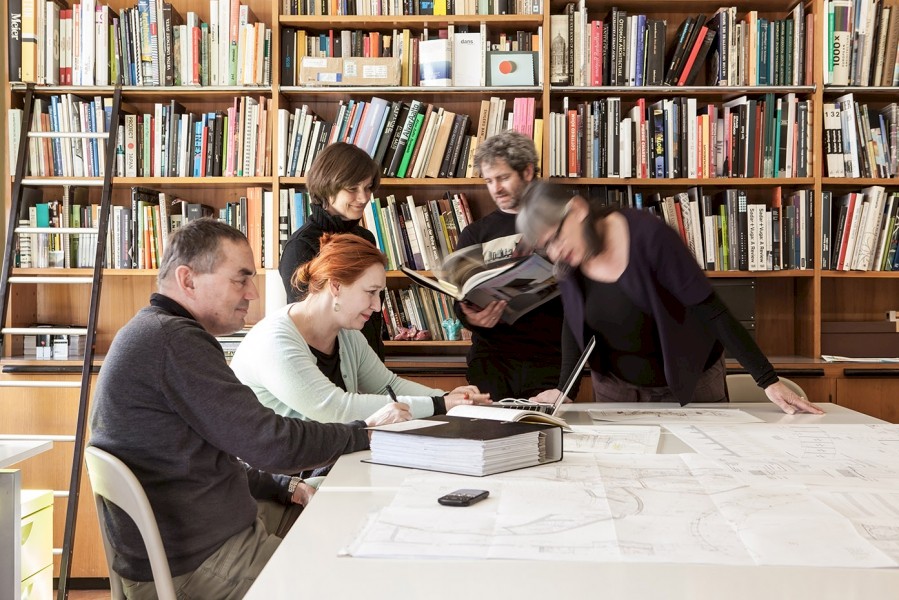 DANS ARHITEKTE čine Rok Bogataj, Miha Dešman, Eva Fišer Berlot, Vlatka Ljubanović i Katarina Pirkmajer Dešman, koji partnerski surađuju od 2004. god.