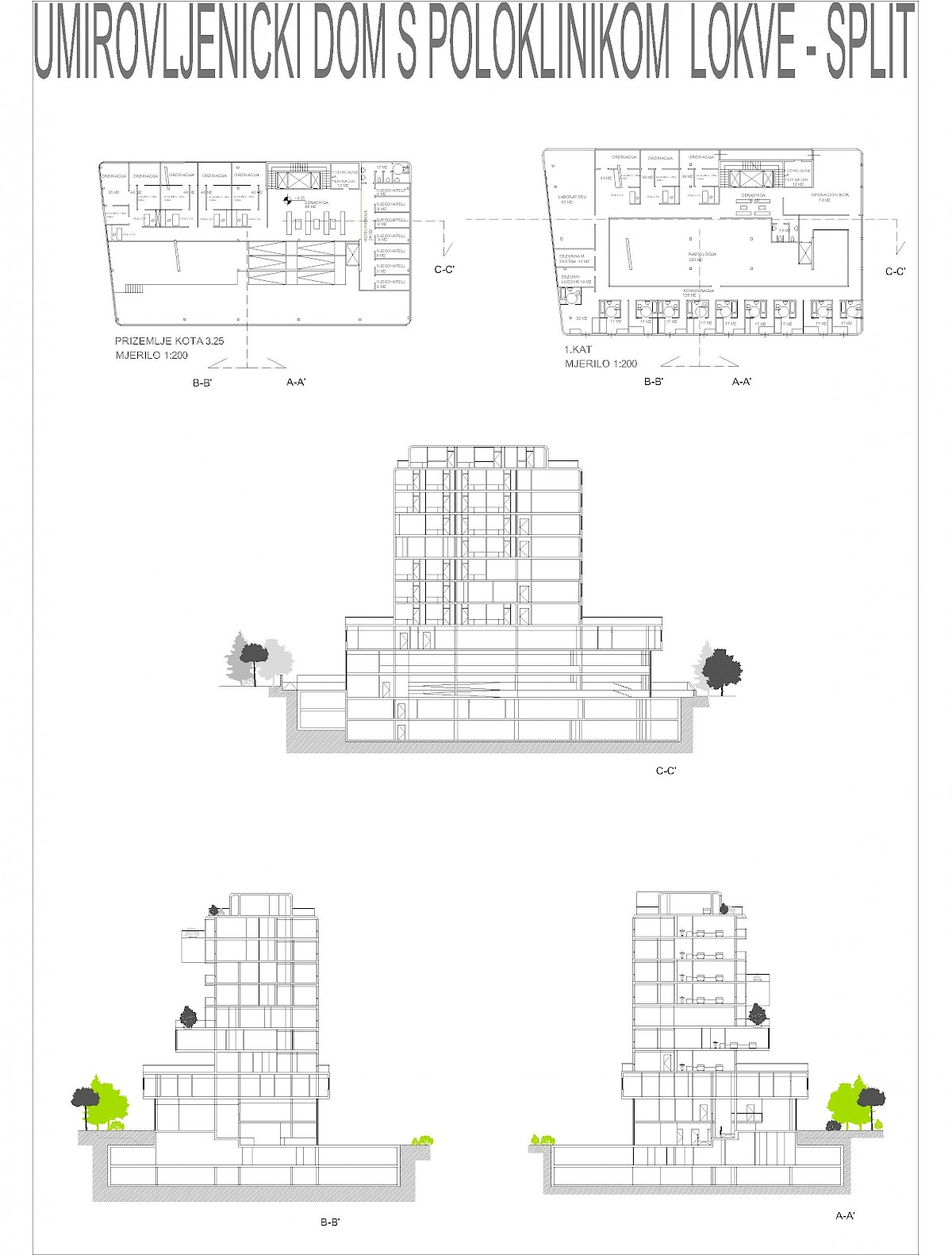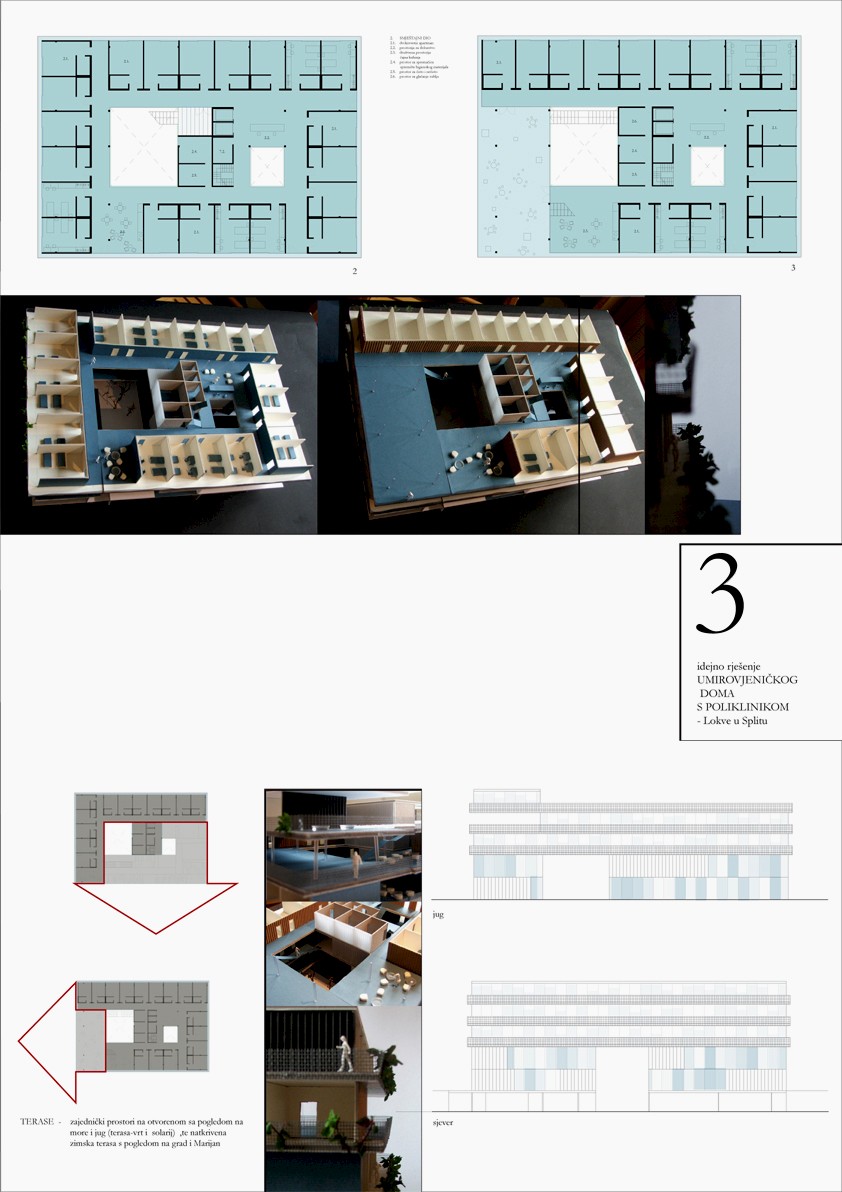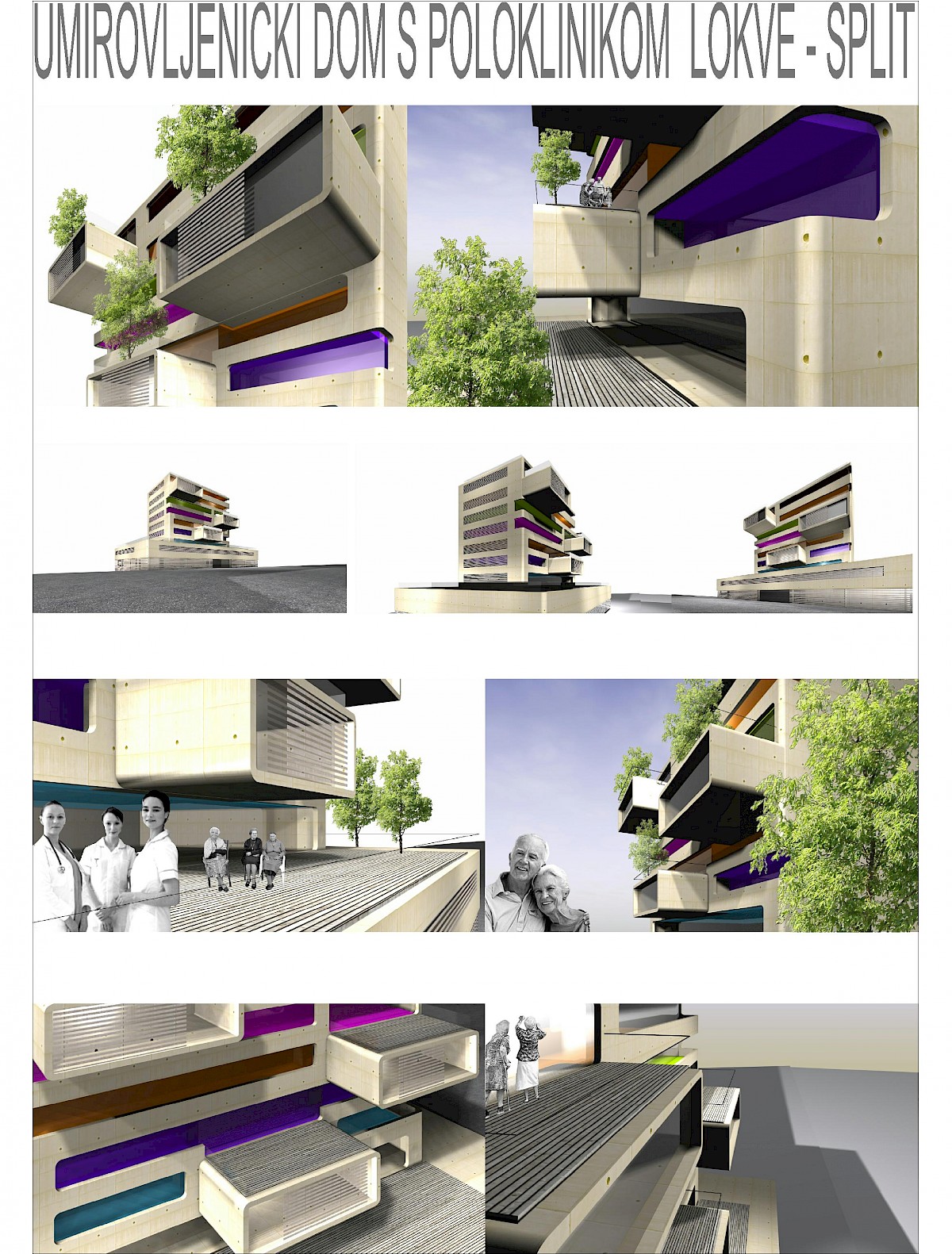 Odluka ovog rada je funkcionalno i volumenski razdvajanje prostora doma od sklopa poliklinike. Time je značajno olakšana artikulacija pojedinih dijelova u konstruktivnom, funkcionalnom i oblikovnom smislu. Organizacija etaža stacionara i pojedinačnih soba je kvalitetna. Posebno se cijeni raznovrsnost soba koja doprinosi humaniziranosti zgrade i ugodnijem boravku. Balkonima se dodatno izražava individualnost svake sobe i doprinosi kvaliteti oblikovanja.